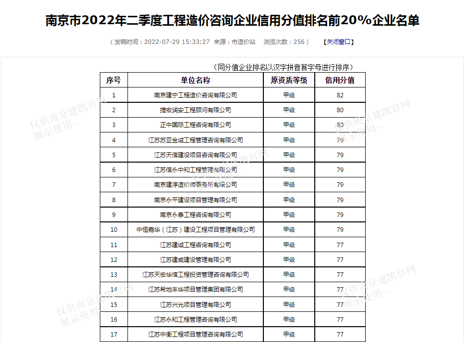 恭喜我司造價(jià)部入選“南京市2022年二季度工程造價(jià)咨詢企業(yè)信用分值排名前20%企業(yè)名單”