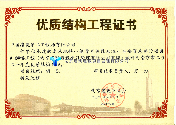 2021年榮獲優(yōu)質(zhì)結(jié)構(gòu)項(xiàng)目—南京地鐵小鎮(zhèn)青龍片區(qū)東流一期安置房建設(shè)項(xiàng)目(A3#樓、A6#樓)